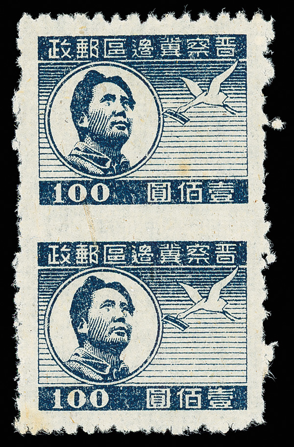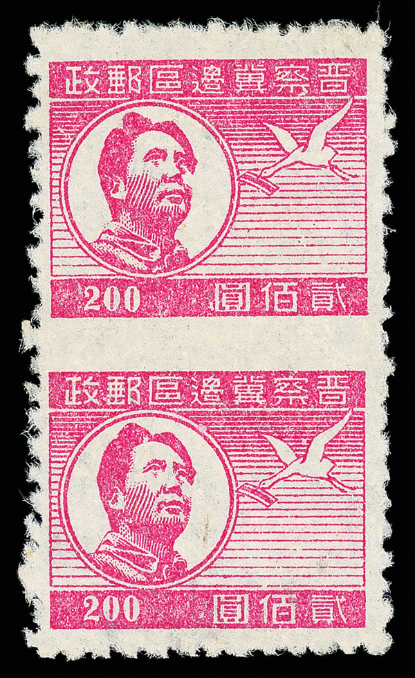 458 ng image1948, Shanxi-Chahar-Hebei Border Area, Chairman Mao, perf. 10 to 11, $100 slate black & $200 carmine, imperforate between (Yang NC68a, NC69a), vertical pairs, fresh on bright paper, without gum as issued, Very Fine, ex "Sunrise Collection". (Image1) (Image2) (Image3) (Image4) (All Images)