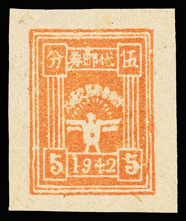 460 ng image1942, Shanxi-Hebei-Shandong-Henan Border Area, Bird on Globe unshaded, "Labels for Postage", 5¢ pale orange (Yang NC161), Post Office fresh with rich color and massive, balanced margins, without gum as issued, Very Fine. (Image1) (Image2) (All Images)