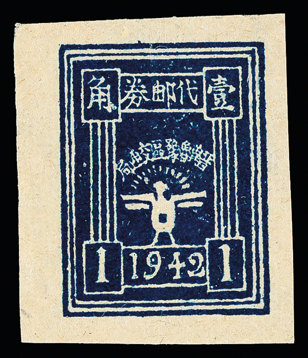 461 ng image1942, Shanxi-Hebei-Shandong-Henan Border Area, Bird on Globe unshaded, "Labels for Postage", 10¢ deep blue (Yang NC162), pristine with bold color and clean impression, large, clean margins all around, without gum as issued, Very Fine. (Image1) (Image2) (All Images)