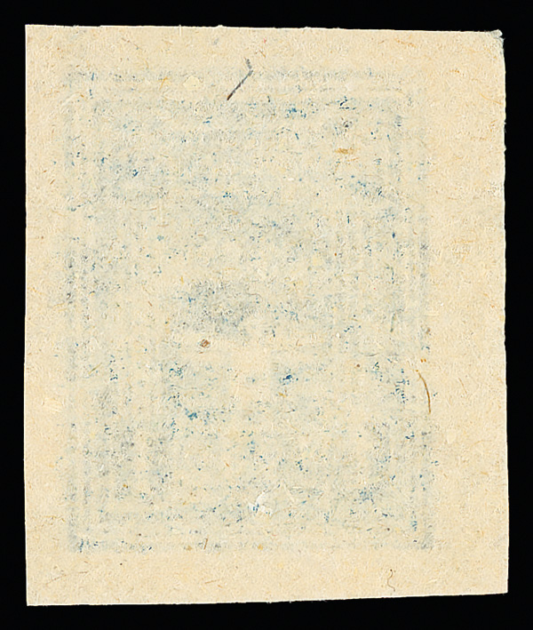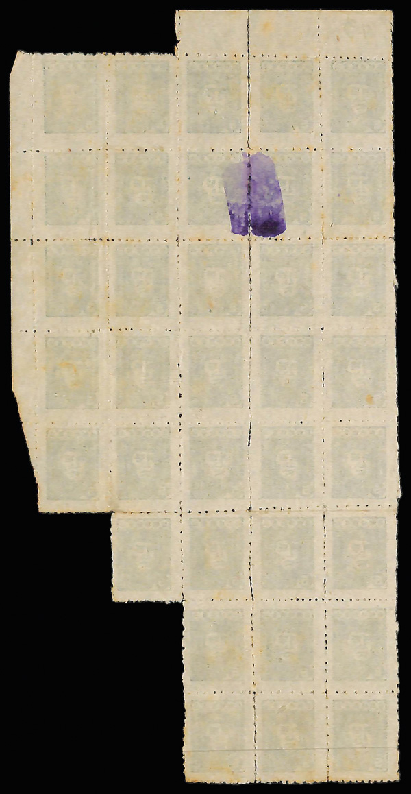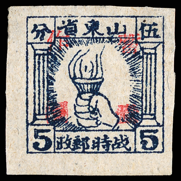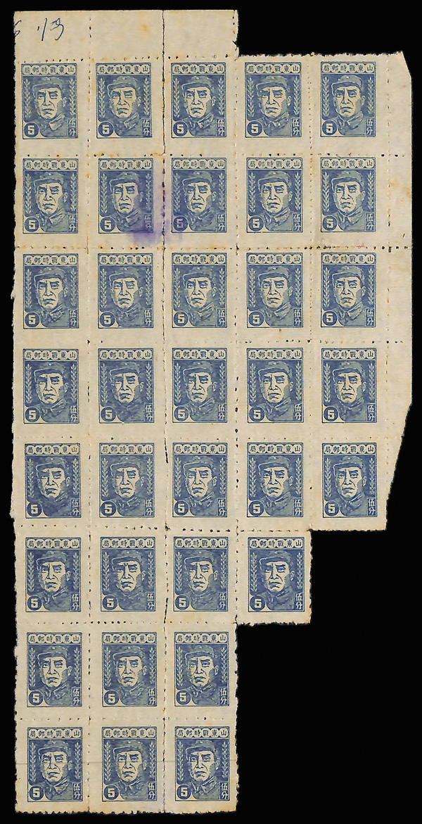 466 ngbl image1945 (Dec.), 5c deep blue Shantung Wartime Post Chu Teh, perf 10 (2009 Yang EC45a), a magnificent and exceedingly rare irregular block of 35 showing the elusive rough perf 10 type; very minor separations, along with unidentified violet mark affecting two stamps, without gum as issued, Fine to Very Fine and choice. A stunning multiple, most likely the largest extant. (Image1) (Image2) (All Images)