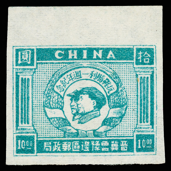 462 ng image1946, Shanxi-Hebei-Shandong-Henan Border Area, First Anniversary of Victory Over Japan, $10 light blue (Yang NC227), top margin single, pristine and bright with big, even margins, without gum as issued, Very Fine to Extremely Fine. (Image1) (Image2) (All Images)