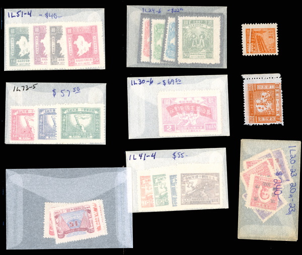 451 imageChina (People's Republic) - Liberated Areas, Enticing Mostly Mint Compilation, nearly 120 glassines, black cards or counterbook pages offering a wide selection of this popular material; note both singles and sets, the vast majority mint though with a number of used items included as well; better items (mint, unless noted) include #1L27-1L29 (4), 1L37-1L40, 1L49-1L50b, 1L55-1L57, 1L58-1L67, 1L126-1L132; 2L70-2L71; 3L13-3L8, 3L82-3L88 (perforated and imperforate), 3L9-3L23, 3L9 var.; 4L1-4L5, 4L17-4L22, 4L23-4L24; 6L33-6L46, 6L63-6L65 (3), 6L90-6L109; 7L6-7L8, 7L9-7L12 (2); 8L43-8L47; EC8b, EC49; NC6, NC216 (2 used), and much more besides; generally clean and fresh with no readily obvious faults; well worth the time to peruse, a great lot; fully imaged online, ex "Sunrise Collection". Shipping charges apply - weight 1.4 lbs. (PDF for this Lot) (Image1)