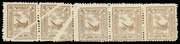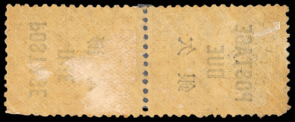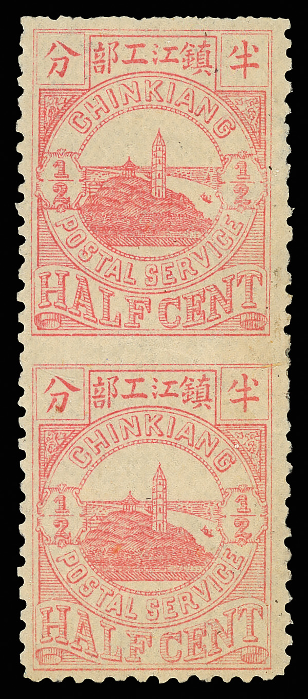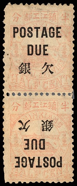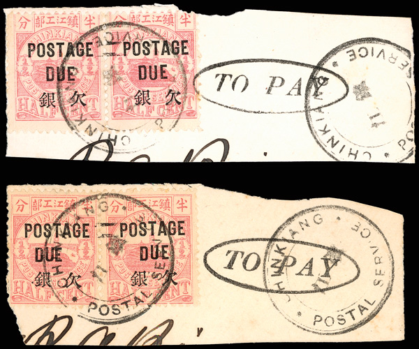 32 Z imagePostage Due, 1895, Second Overprint in black on ½¢ rose, pair of varieties (Chan LCHD8di, LCHD8ei. Scott J17d, J17f), each tied on piece by two "Chinkiang/Postal Service" postmark with oval "TO PAY" handstamp alongside; comprising "U" of "DUE" handstamped (Chan LCHD8di. Scott J17d), right stamp (torn at top right) additionally showing "'DUE' shifted to left" variety in horizontal pair with normal, and "DU" handstamped (Chan LCHD8ei. Scott J17f), horizontal pair, each showing the variety, the left stamp additionally showing the "'DUE' shifted to left" variety, Fine to Very Fine or better. (Image1) (Image2) (All Images)