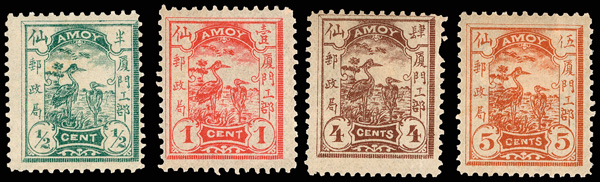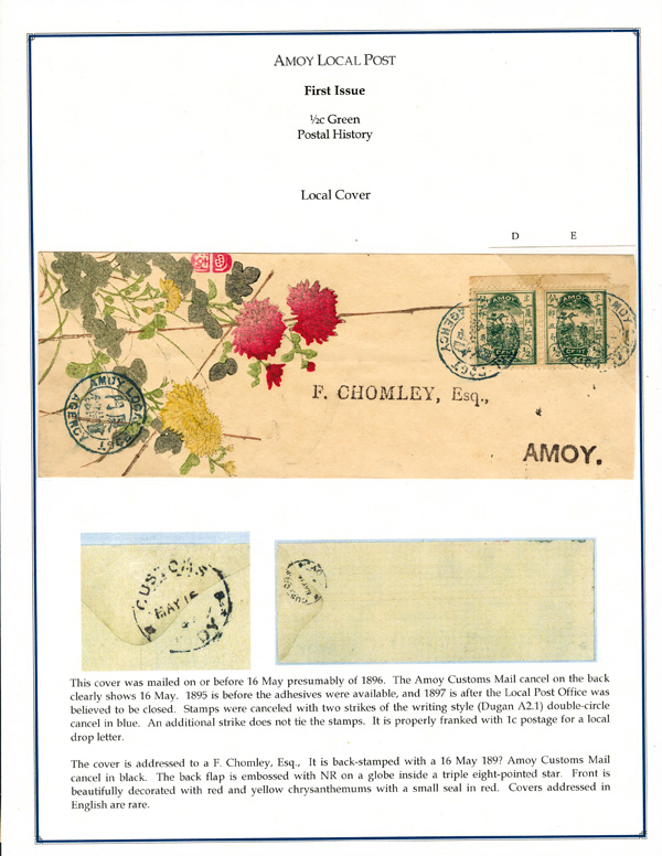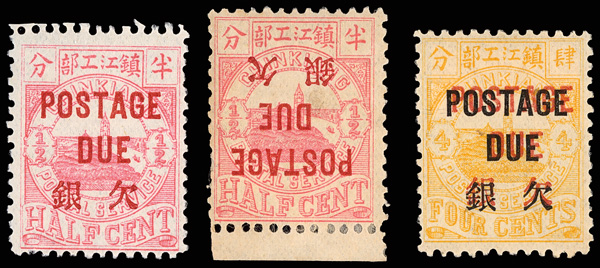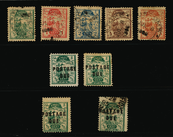 28 image1895, First issue, specialized holding (Scott 1-2, 4-6, J6c. Livingston 1-2, 4-6, D8 vars.), comprising ½c to 2c (type II), 4c and 5c (Livingston 1-2, 4-6. Scott 1-2, 4-6), each cancelled by "Customs/ Kowloon" double-ring datestamp of "Jul 8 1895", the first with slight thinning, rare and unusual strikes; ½c green (Livingston 1. Scott 1), horizontal pair from the top of the sheet, transfer types D-E, tied by "Amoy Local Post/ Agency" bilingual double-ring handstamp in blue, with another strike adjacent, on ca. 1896 local decorative envelope, showing "Customs/ Amoy" double-ring datestamp (5.16) on reverse, a Very Fine local usage in combination with the Customs Post; and Postage Due, black overprint, ½c green, Stone II, "Due" shifted to right (Livingston D8 var. Scott J6c), two examples, positions 9 and 10 of the Setting, unused, the first with part o.g.; the latter has light wrinkling; and the same with "Due" shifted to right (Livingston D8 var. Scott J6c), two examples, transfer type A, position 6 of the Setting, both centered to lower left, unused with small part o.g. and canceled by c.d.s. respectively, Fine to Very Fine overall, fully imaged online. Scott $1,500 for Dues alone (HK$ 11,540). (Image1) (Image2) (Image3) (All Images)