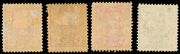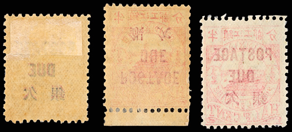 30 og/ng image1895, Selection of Postage Dues including varieties (Scott J8//J17b), group of four, comprising #J8 (regummed), J8a, J12 and J17b, sound and generally fresh, Fine to Very Fine or better. Scott $1,040 (HK$ 8,000). (Image1) (Image2) (Image3) (Image4) (All Images)