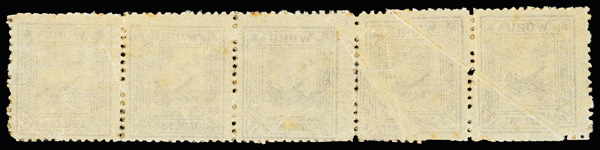 34 nh image1894, First Issue, 1¢ brown, horizontal strip of five with dramatic pre-printing folds (Chan LW3. Scott 3), fresh with clean impression, the folds affecting the left three stamps, o.g., never hinged, Very Fine, a fun collateral item. (Image1) (Image2) (All Images)