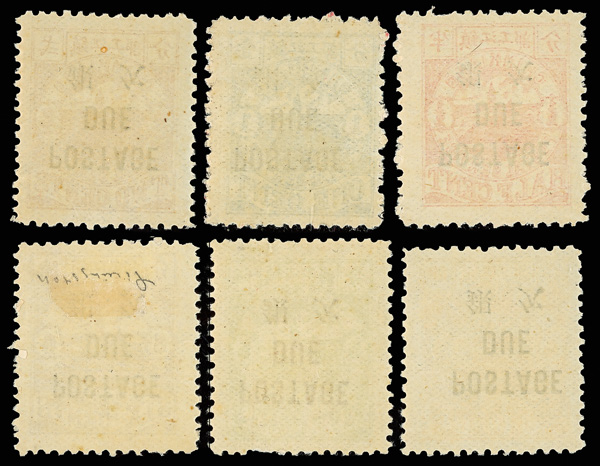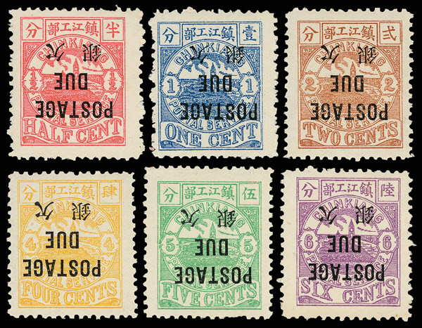 31 nh/og imagePostage Due, 1895, ½¢-6¢ wide surcharge in black, surcharges inverted (Chan LCHD8b-LCHD13b. Scott J17a-J22a), Post Office fresh with vibrant colors on bright white paper, 5¢ and 6¢ lightly hinged, others never hinged (or appear so), Very Fine and choice, ex W.L. Chow. Scott $1,715 (HK$ 13,190). (Image1) (Image2) (All Images)