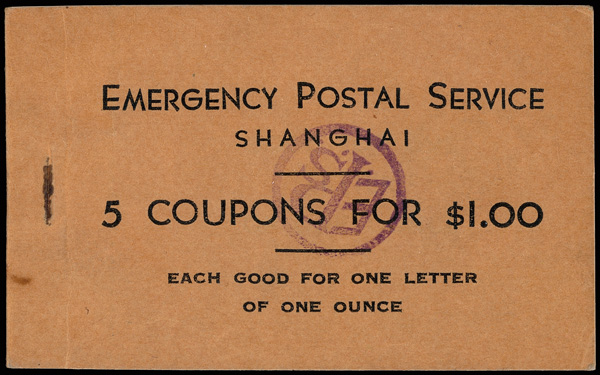 26 nh image1932, "Emergency Postal Service", $1 booklet of coupons, complete and unexploded, fresh with front cover and each coupon bearing circled "EPS" handstamp; rusting of original staple, back cover creased, o.g., never hinged, otherwise Very Fine, a nice collateral item; these were used during February 1932 following the "January 28th Incident", ex "Sunrise Collection". (Image1) (Image2) (All Images)
