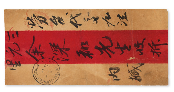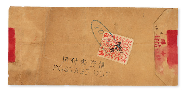 33 cover imagePostage Due, 1895, Type A overprint on 2¢ red (Chan LKD4. Scott J4), brightly colored single on reverse of red band cover, tied by blue oval "TO PAY" handstamp with bilingual "POSTAGE DUE" handstamp below in black; address side with "Postal-Service, Foochow/T/FE 3/97/China" postmark; cover with fold well away from stamp, Fine to Very Fine. (Image1) (Image2) (All Images)