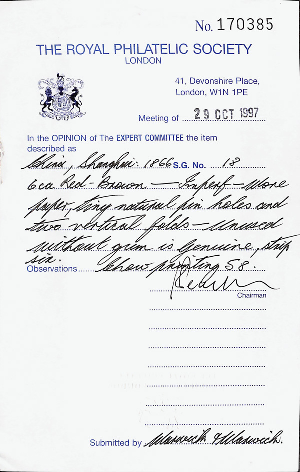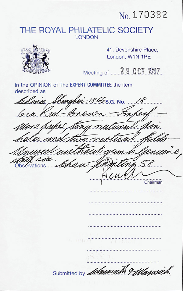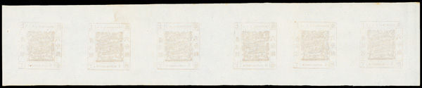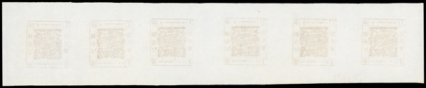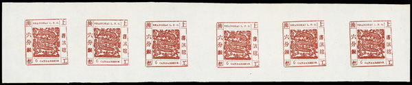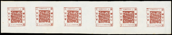 24 ngbl image1866, Large Dragon (Antique Numerals, "CANDAREENS" plural), 6ca red brown, wove paper (Chan LS18. Scott 21), Printing 58, complete sheet of 6, clean with flawless impressions and crisp detail, without gum as issued; tiny natural pinholes, two vertical files (through right inner margin position 2, and between positions 4 & 5), still Very Fine, with 1997 R.P.S.L. certificate. Scott $2,100 as singles (HK$ 16,150). (Image1) (Image2) (Image3) (All Images)