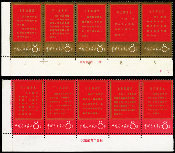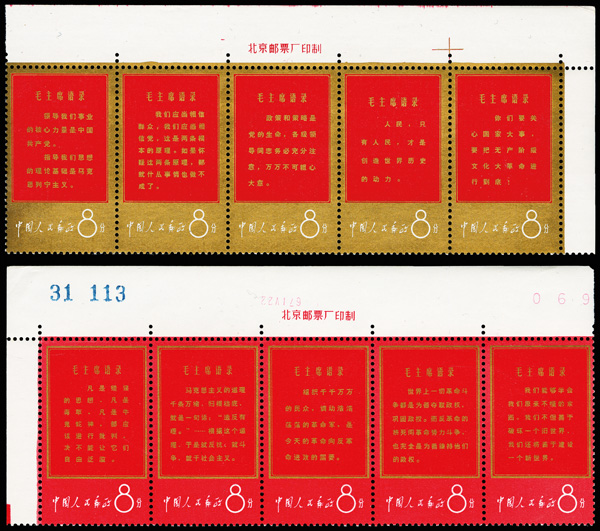 551 nh image1967, Thoughts of Chairman Mao (W1) complete (Yang W1-11. Scott 938-948), se-tenant strips of five (#943a and 948a) each an unfolded top right corner margin imprint strip, sound with brilliant, beaming gold and perfect gum, o.g., never hinged, otherwise Very Fine, a Gem set, ex "Sunrise Collection". Scott $4,710 (HK$ 36,230). (Image1) (Image2) (Image3) (Image4) (All Images)