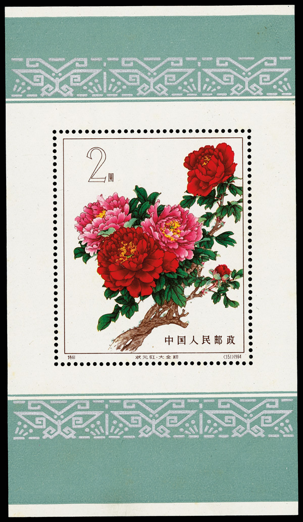 544 ng image1964, Chinese Peonies souvenir sheet (S61M) (Yang S61M. Scott 782), pristine and sound with vibrant colors and square corners, without gum as issued, Very Fine, ex "Sunrise Collection". Scott $2,500 (HK$ 19,230). (Image1) (Image2) (All Images)