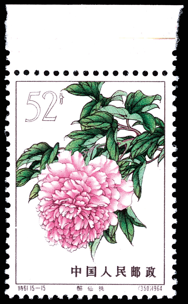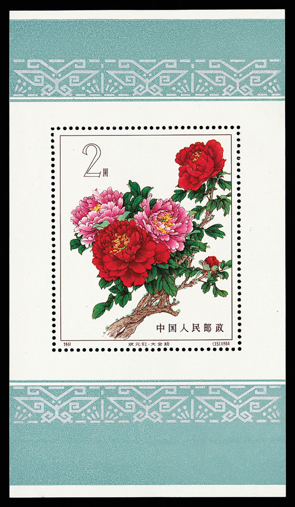 543 ng image1964, Chinese Peonies souvenir sheet (S61M) (Yang S61M. Scott 782), without gum as issued, pristine with lovely fresh colors and sharp corners; tiny tear at bottom left, otherwise Very Fine. Scott $2,500 (HK$ 19,230). (Image1) (Image2) (All Images)