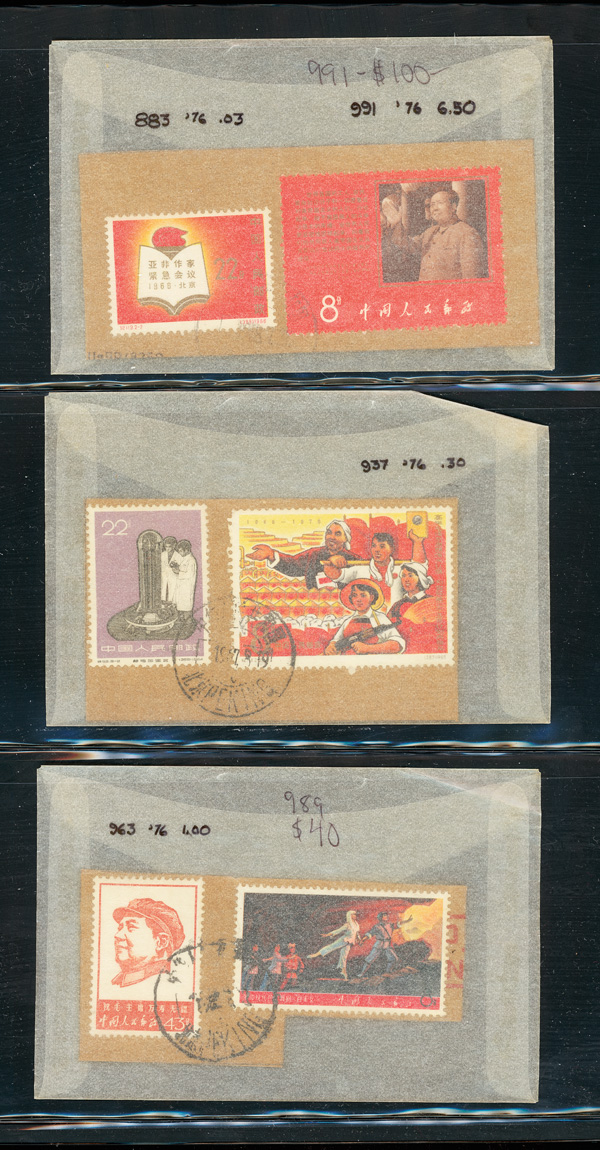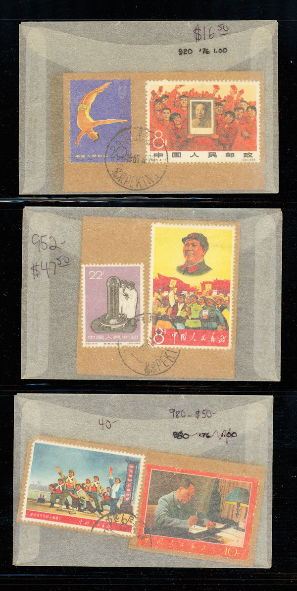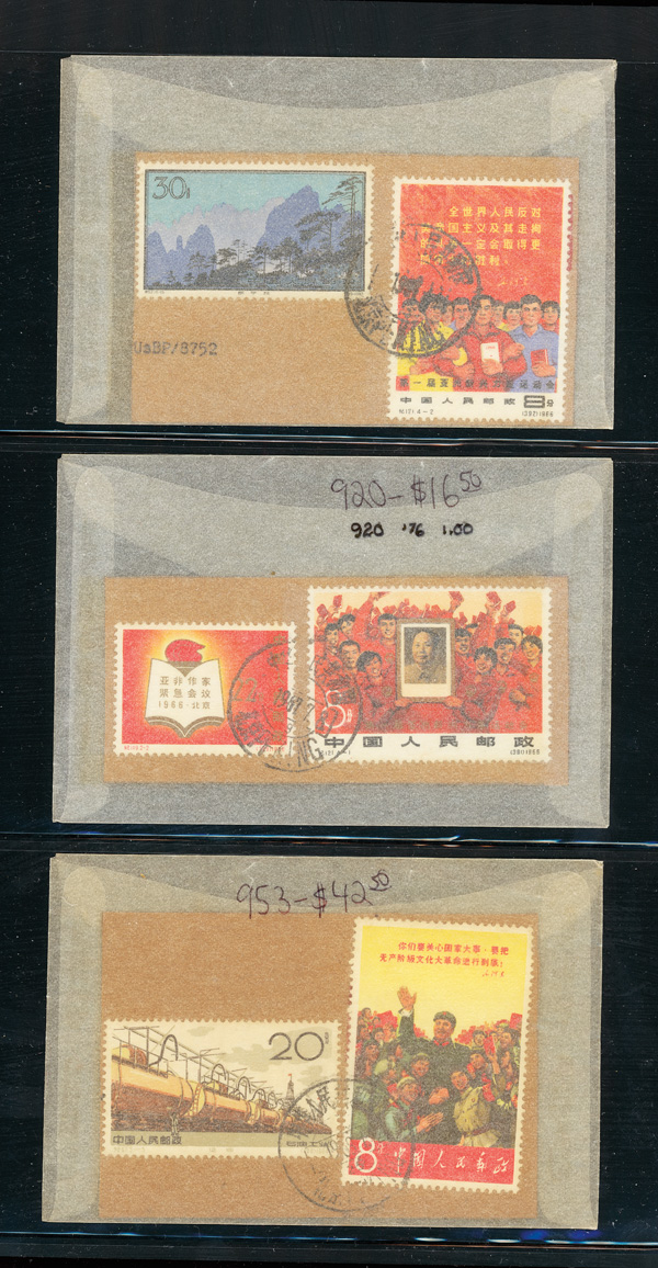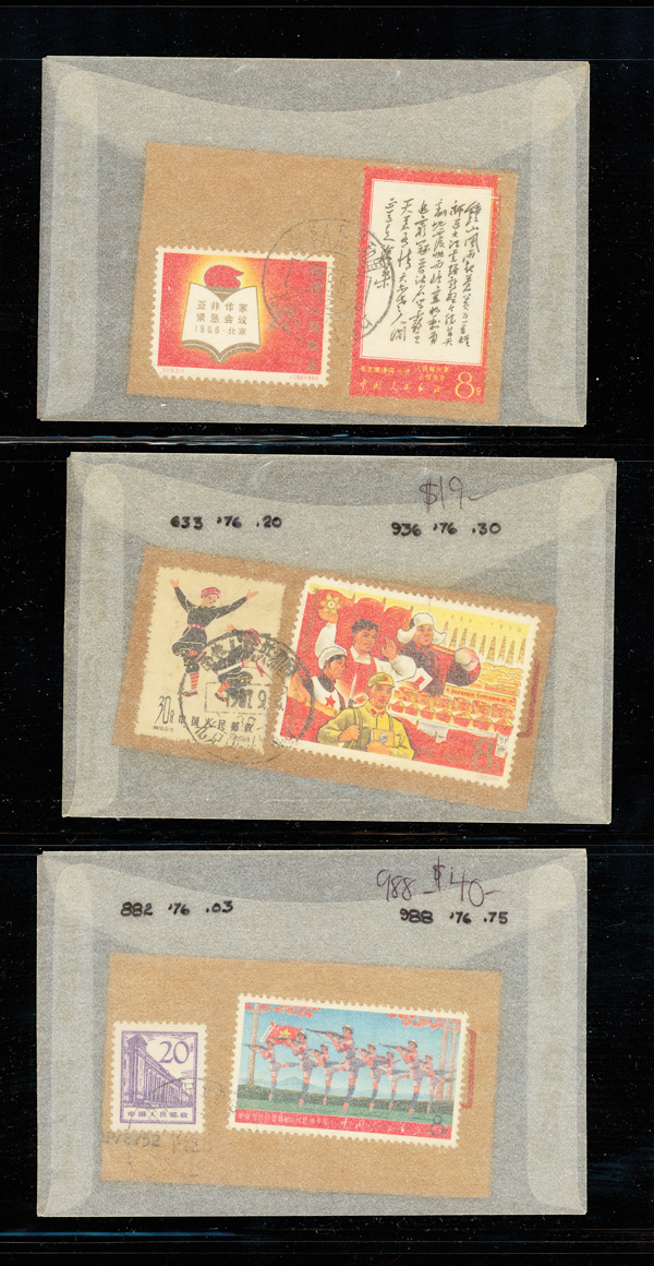 549 Z image1967-68, Selection of Cultural Revolution Issues on piece, group of 28, individually glassined with most identified by Scott number and priced, offering a nice mix of all-different issues on piece; all in combination with a second stamp, some from the same period, some not; the pieces neatly trimmed and prepared, Very Fine, fully imaged online. Shipping charges apply - weight 0.6 lbs. (Image1) (Image2) (Image3) (Image4) (Image5) (Image6) (Image7) (Image8) (Image9) (Image10) (All Images)
