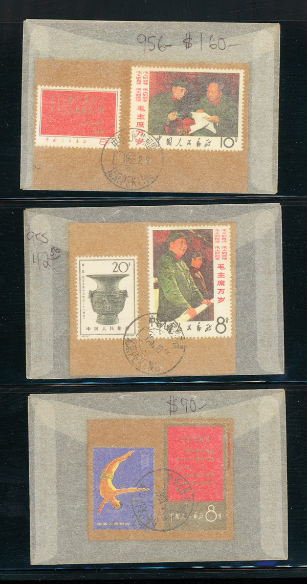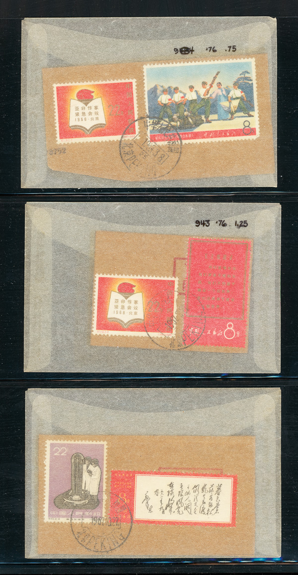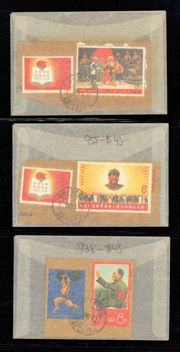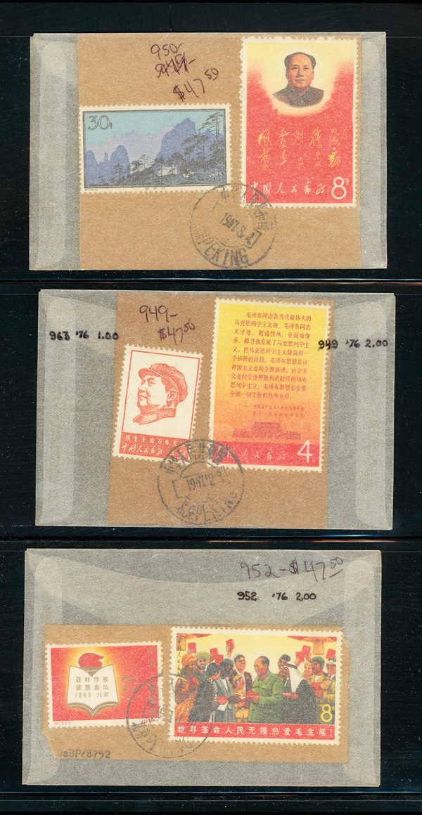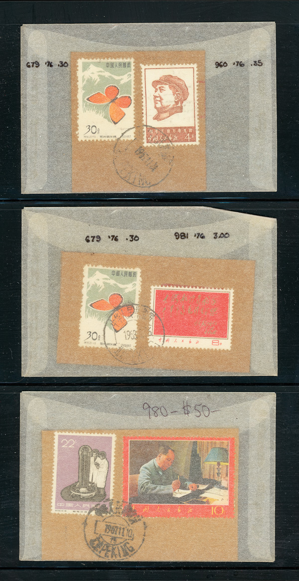549 Z image1967-68, Selection of Cultural Revolution Issues on piece, group of 28, individually glassined with most identified by Scott number and priced, offering a nice mix of all-different issues on piece; all in combination with a second stamp, some from the same period, some not; the pieces neatly trimmed and prepared, Very Fine, fully imaged online. Shipping charges apply - weight 0.6 lbs. (Image1) (Image2) (Image3) (Image4) (Image5) (Image6) (Image7) (Image8) (Image9) (Image10) (All Images)