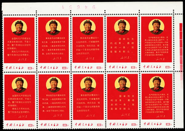 560 nhbl image1968, Directives of Chairman Mao (W10) complete (Yang W55-59. Scott 996a), top right corner margin block of 10, yielding two unfolded strips of five, wonderfully fresh and pristine in all respects, o.g., never hinged, Extremely Fine, a gem multiple, ex "Sunrise Collection". Scott $4,750 as two strips (HK$ 36,540). (Image1) (Image2) (All Images)