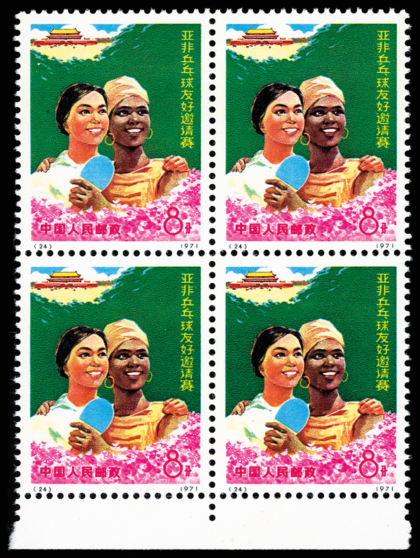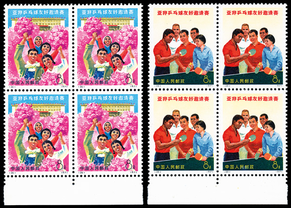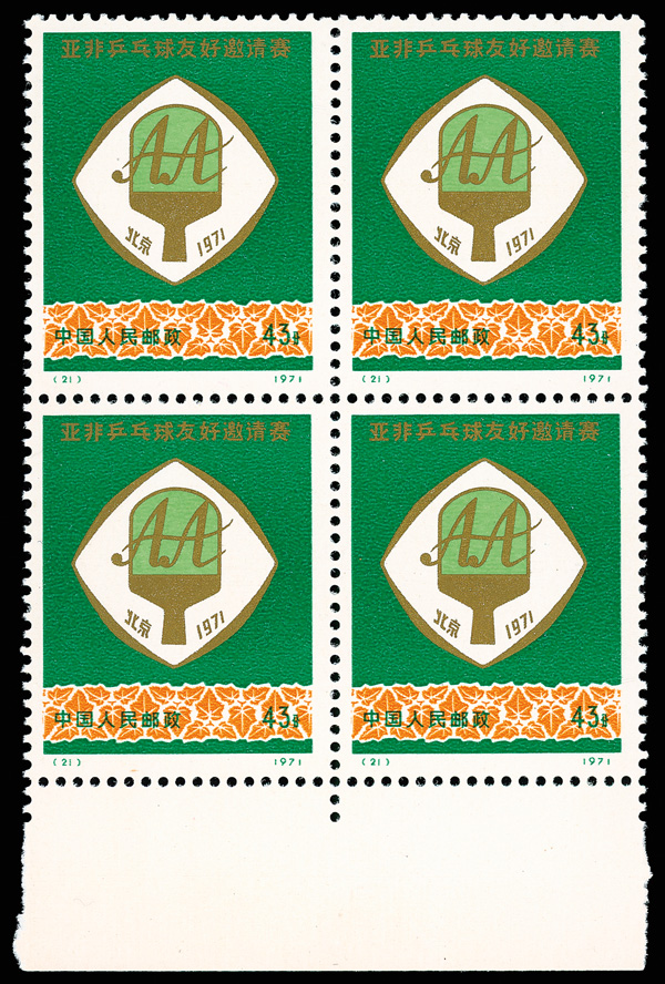 566 nhbl image1971, Afro-Asian Table Tennis Tournament (N5) complete (Yang N21-24. Scott 1076-1079), bottom margin blocks of 4, sound and bright, o.g., never hinged, Very Fine. Scott $790 as singles (HK$ 6,080). (Image1) (Image2) (Image3) (Image4) (Image5) (Image6) (All Images)