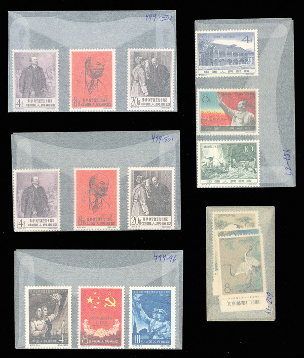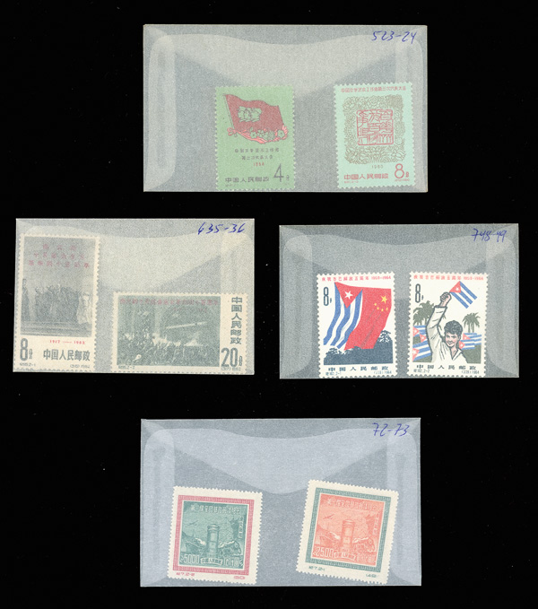 (2), 930-935, 938, 942, 949-950 (2), 951 (4), 953, 954, 957-959, 958, 960-964, 965-966 (2), 991 (3), 999 (3); mint #5-7, 528, 600-604, 606-609, plus various Liberated Areas issues (most Scott-listed), and a handful of pre-1949 China (including
