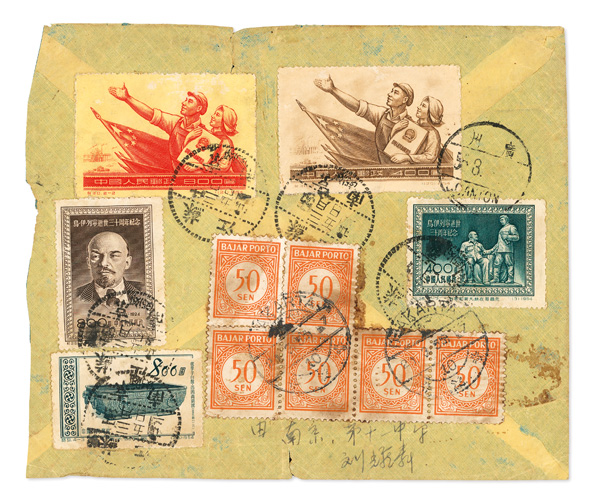 1955 (Mar. 5), Postage Due cover from Nanking to Jakarta, Indonesia, franked (front and back) by eight PRC commemorative