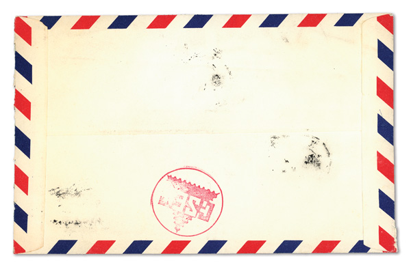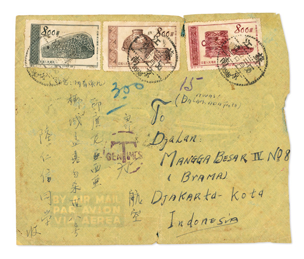 stamps tied by Nanking c.d.s.'s and showing Canton transits; reverse bears six copies of Indonesia 50s Postage Dues with Djakarta Mar. 21 arrival c.d.s.'s, while front notes circled "cenTimes" Due handstamp; well-traveled with wrinkles, etc., Fine,