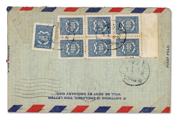 addressed to Shanghai, franked on reverse by top margin vertical block of six $100 and $1000 single First Issue Postage Dues (#J1, J5) with three strikes (two tying) of Shanghai bilingual daters (Nov. 29, as docketed on front); a nice on-cover
