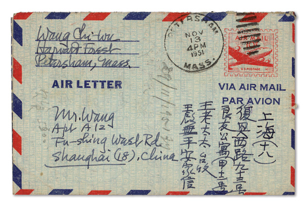 1951 (Nov. 13), Incoming Postage Due aerogramme from US to Shanghai, 10¢ aerogramme cancelled Petersham, Mass.,