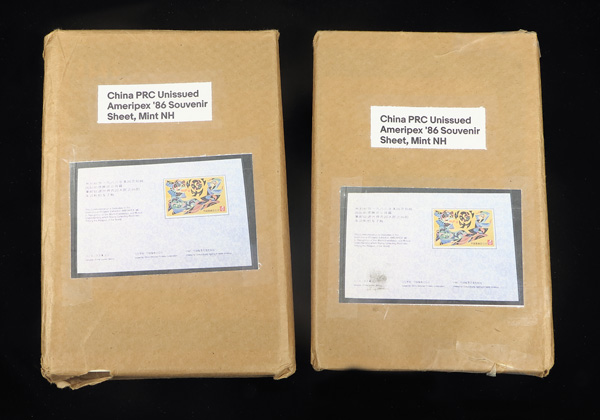 200 in each?) of this attractive non-postal souvenir sheet, produced for insertion into the Ameripex '86 catalogue; corners of packs appear clean and undamaged, but expect a ding or two after 20 years, Very Fine. Shipping charges apply - weight 3.2