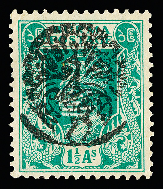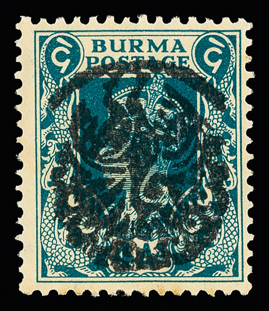 703 nh image1945, 1½a King George VI, Henzada overprint Type II, overprint inverted, unissued (J.S.C.A. 1B42 var.), the basic stamp richly colored, the overprint light but full and clearly top-to-tail, o.g., never hinged, Very Fine, not listed in JSCA; ¥45,000 for normal, a most uncommon error. (Image1) (Image2) (All Images)