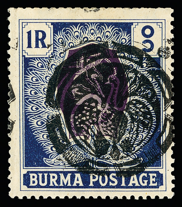 690 og image1942, 1R King George VI, Myaungmya overprint Type III (Scott 1N43. SG J18), fresh and wonderfully centered, sporting a rivet flaw, o.g., lightly hinged; blunted perforations at top noted for accuracy, otherwise Very Fine. SG £600 (HK$ 6,160). (Image1) (Image2) (All Images)