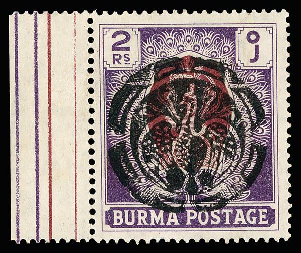 691 og image1942, 2R King George VI, Myaungmya overprint Type III (Scott 1N44. SG J19), left margin single, Post Office fresh with superior centering and cleanly struck overprint, o.g., very lightly hinged, Very Fine. SG £350 (HK$ 3,590). (Image1) (Image2) (All Images)
