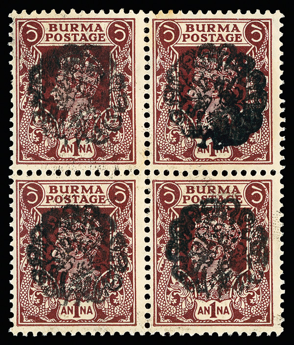 693 nh/ogbl image1942, 1a King George VI, Pyapon overprint (Scott 1N46. SG J19), block of 4, a lovely multiple, sound with deep color on bright paper; lightly hinged at top, bottom never hinged, Very Fine. SG £480 as singles (HK$ 4,930). (Image1) (Image2) (All Images)