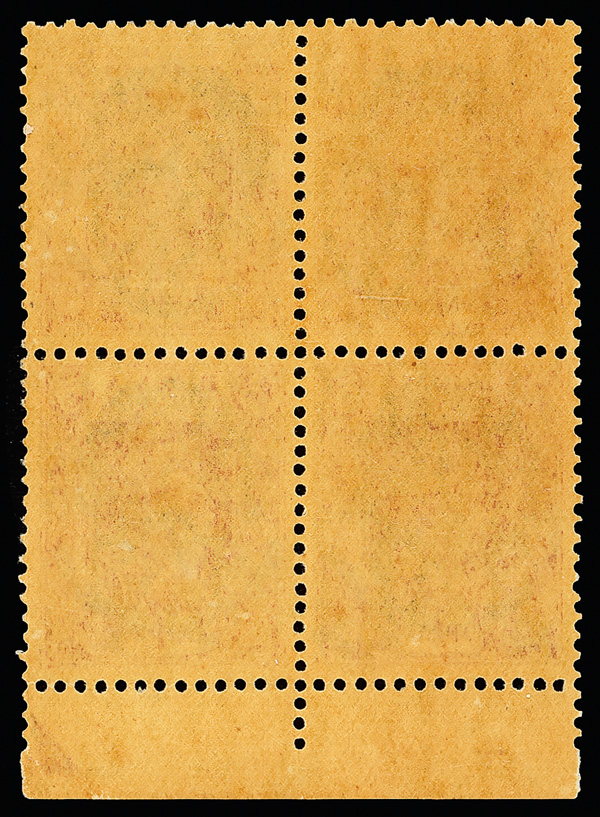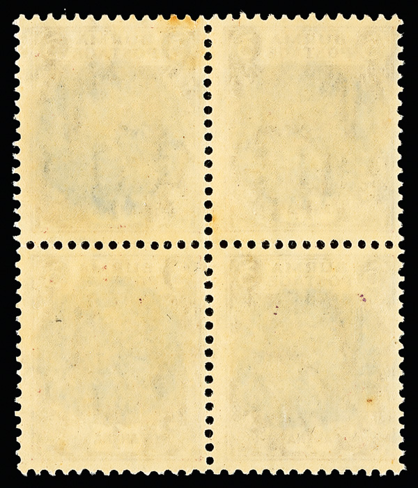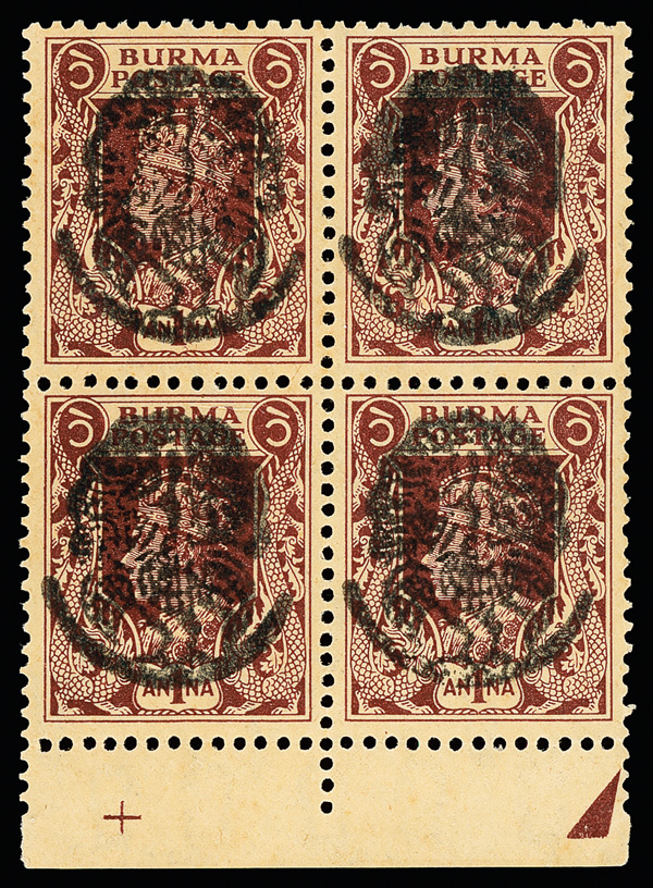 701 nhbl image1945, 1a King George VI lithographed, Henzada overprint Type II, unissued (2012 J.S.C.A. 1B41), bottom margin block of 4, a pretty marginal, with printer's cross and part arrow in selvage, fresh and boldly colored, o.g., never hinged, Very Fine. (Image1) (Image2) (All Images)