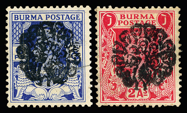 692 og image1942, 6p and 2a King George VI, Pyapon overprint (Scott 1N45, 1N48. SG J19a, J20), pretty twosome, fresh and sound with attractive centering and bold overprints; 6p very lightly hinged, 2a hr, Very Fine. SG £230 (HK$ 2,360). (Image1) (Image2) (All Images)