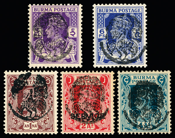 698 nh/og image1945, 3p//4a King George VI, Henzada overprint Type II, unissued (2012 J.S.C.A. 1B39//1B44), comprising 3p, 6p, 1a, 2a and 4a values, each sound with bold color, Very Fine, 1a signed. (Image1) (Image2) (All Images)