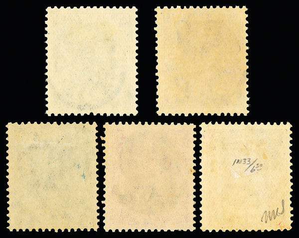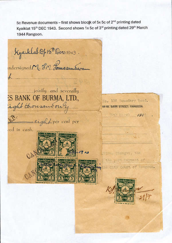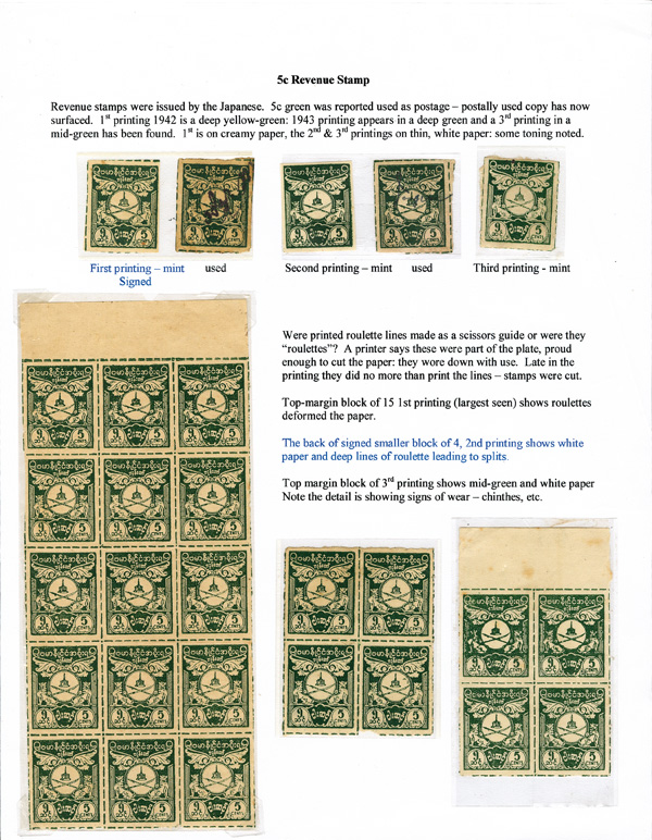 705 imageJapanese Occupation of Burma, Small Specialized 5c Revenue Collection, 1942-43, neatly arranged on two exhibition-style pages with full annotation, offering all three printings (First and Second mint and used, Third mint), paper and printing varieties, a top margin block of 15 First Printing—the largest known—plus several on-document uses; clean and fresh, a fabulous find for the Revenuer or Burma specialist, Very Fine, fully imaged online. (Image1) (Image2) (All Images)