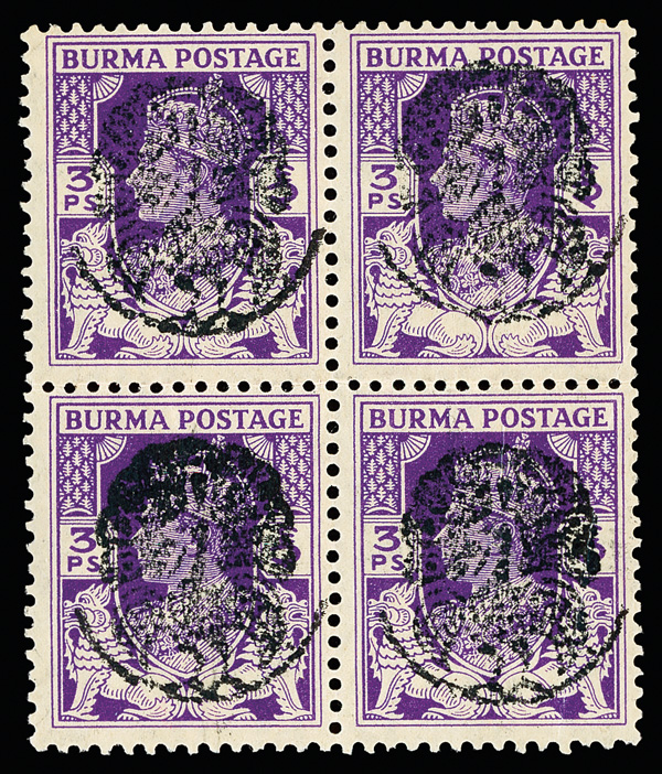 699 nhbl image1945, 3p King George VI, Henzada overprint Type II, unissued (2012 J.S.C.A. 1B39), block of 4, face-fresh with bold color and lightish overprints, o.g., never hinged; gum crease positions 2, 4 noted for accuracy, Very Fine. (Image1) (Image2) (All Images)