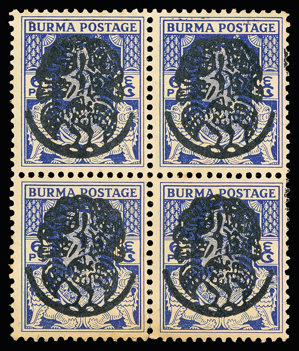700 nhbl image1945, 6p King George VI, Henzada overprint Type II, unissued (2012 J.S.C.A. 1B40), block of 4, fresh and clean with crisp detail and bold overprints, o.g., never hinged; gum disturbance position 4 noted strictly for accuracy, Very Fine. (Image1) (Image2) (All Images)