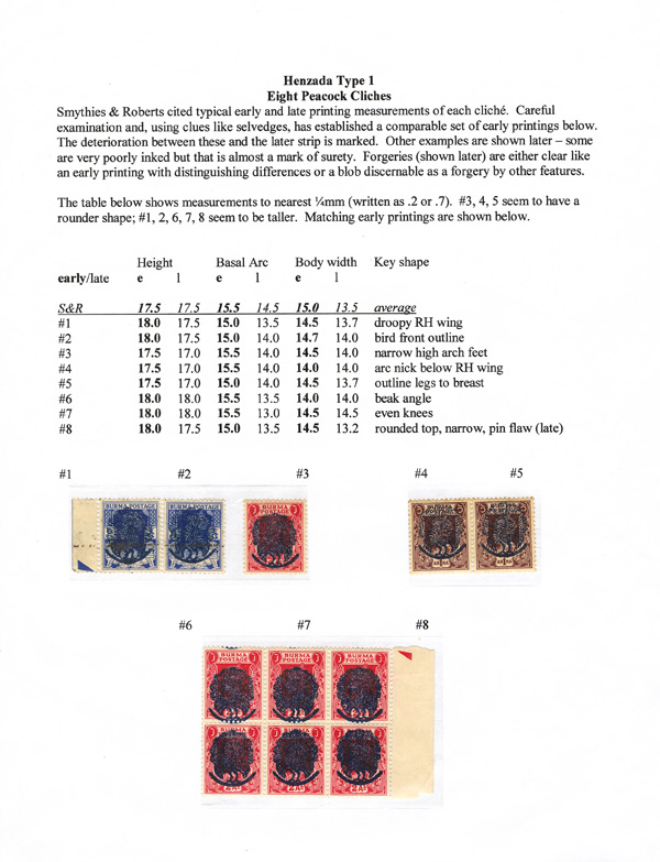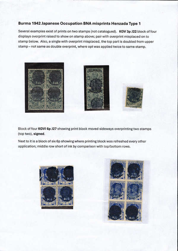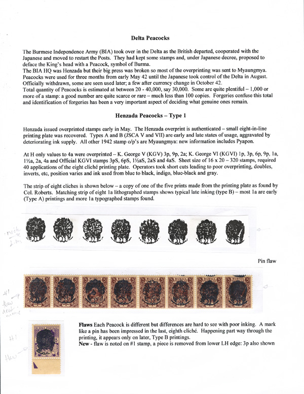 706 imageJapanese Occupation of Burma, Specialized Holding of Henzada Type I Peacocks, 1942-45, neatly mounted on three exhibition-style pages, offering a wealth of seldom-seen material for the specialist, comprising a horizontal strip of eight clichés on 1a plus pin flaw on bottom margin 3p single; a second page with layout of the cliché types on a mix of denominations, plus a third page of misprints—misplaced, doubled, etc.; some items signed as noted in full write-up; a lovely holding difficult to duplicate, Very Fine overall, fully imaged online. (Image1) (Image2) (Image3) (All Images)
