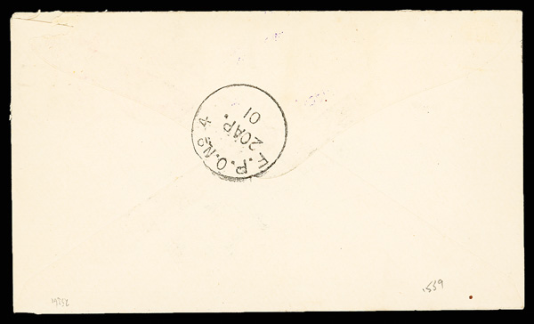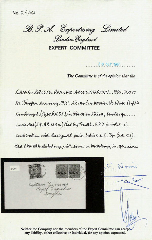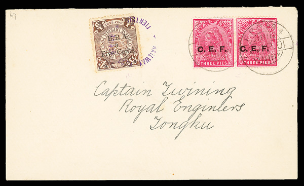730 cover image1901 (Apr. 20), Tongku Local cover, franked by inverted 5c on 1c B.R.A. overprint (violet "Railway Post/Tientsin" cancel) plus horizontal pair of India 3p C.E.F. overprints ("F.P.O. No. 4" cancels), to a Captain in the Royal Engineers; reverse with same-day F.P.O receiver, Very Fine. An exceedingly rare item, especially so on cover, ex "Sunrise Collection", with 1987 B.P.A. certificate. (Image1) (Image2) (Image3) (All Images)