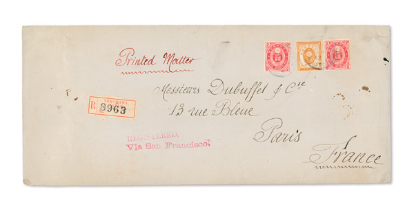 745 cover image1897 (Nov. 29), Registered Printed Matter cover from Yokohama to Paris, franked by Kobans, two 2s carmine rose (#73) and 1888 10s brown orange (#79), tied by two faint Yokohama Japan postmarks; straightline "Registered" and "Via San Francisco" handstamps plus Yokohama Registry label on front, Paris receiver (Dec. 31) on reverse; an unusual 14s Printed Matter rate cover, Fine to Very Fine. (Image1) (Image2) (All Images)