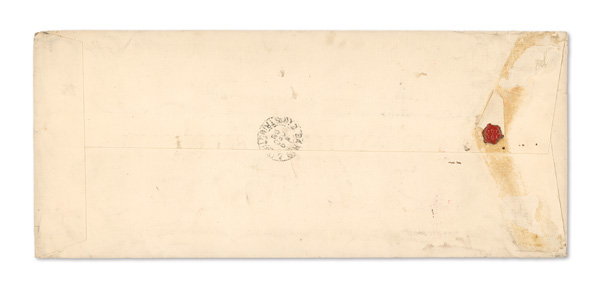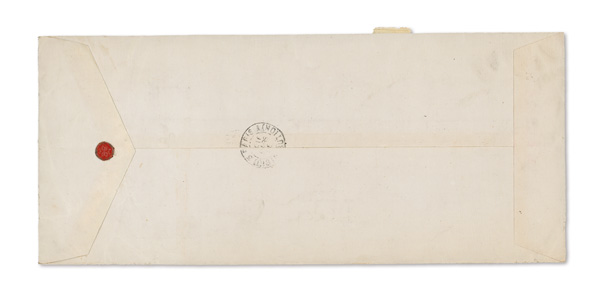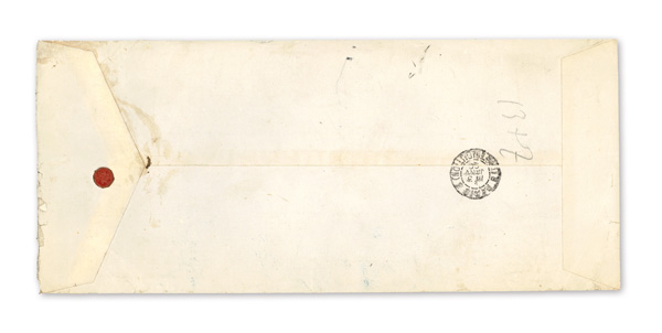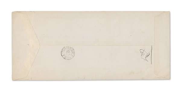 742 cover image1896 (Aug. 8), Registered cover from Kobe to Paris, an attention-grabbing franking covering the entire back side of the envelope, comprising two horizontal strips of five 2s plus pair and block of eight 5s Gen. Kitashirakawa and horizontal blocks of ten 2s and 12 5s Field Marshall Arisugawa stamps, all tied by multiple strikes of Kobe postmark; reverse additionally with two rich red wax seals with black "D K" impressed; front with "Greppi & Company/Kobe" double-oval company chop, "Via San Francisco" and "Registered" manuscript endorsements, a Kobe Registry label and Yokohama Aug. 10 transit; a grand piece, Fine to Very Fine. (Image1) (Image2) (All Images)
