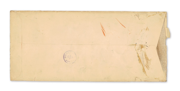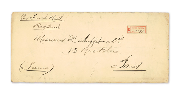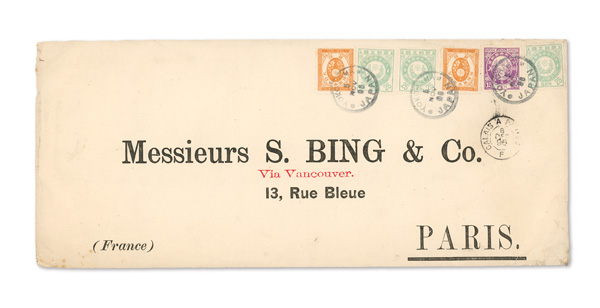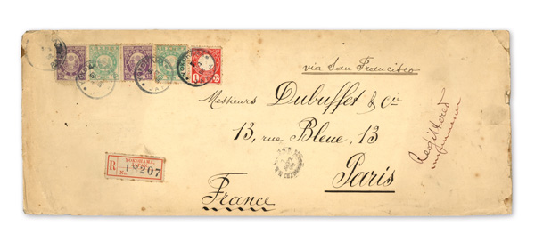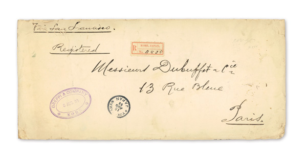 750 cover image1900 (Mar. 29), Registered cover from Kobe to Paris, franked by horizontal strip of seven 10s New Kobans (#79), tied by four strikes of Kobe postmark; manuscript "Via San Francisco" and "Registered" endorsements plus Kobe Registry label and "Paris-Etranger/2 Mai/00/Chargements" receiver on front; reverse with Mar. 31 Yokohama transit; backflap missing, but an eye-catching six-times Registered rate cover, Fine to Very Fine. (Image1) (Image2) (All Images)