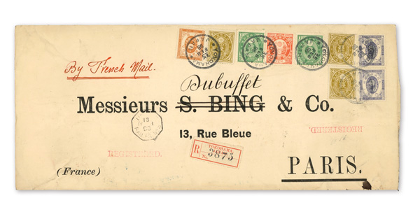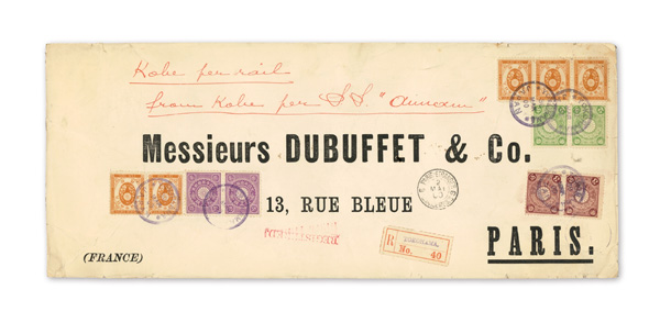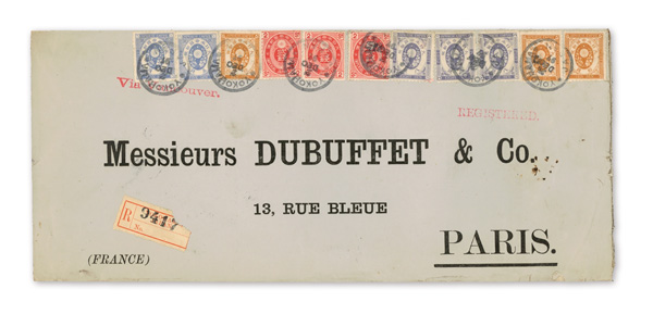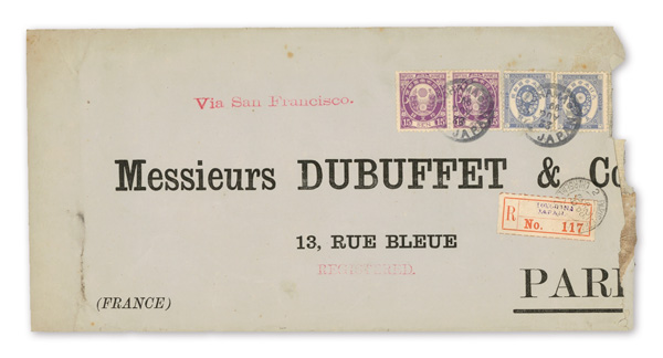 751 cover image1900 (Mar. 30), Mixed-franking Registered cover from Yokohama to Paris, franked by 10s New Koban (#79, pair & strip of three) plus pairs of Kiku 2s, 3s and 15s values, all tied by Yokohama postmarks; manuscript "Kobe per rail/from Kobe per S.S. 'Annam'", straightline "Registered" handstamp, Yokohama Registry label and Paris May 2 receiver all on front; 10s strip of three slightly curled by envelope, but intact and otherwise sound, Fine to Very Fine. (Image1) (Image2) (All Images)