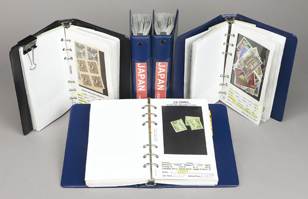 753 imageJapan, Mostly Mint Holding in Counter Books, 1874-1997, Five counter books loaded with premium material with each item identified by Scott number, details on gum condition in the case of mint, and catalogue value. Highlights include used #46-47, 50 (syllabic 2), 58 (perf 9), 66, 508b, C3-7, C9-13, M2, mint 47, 103a, 108, 110 (2), 111-12 (2), 113-14 (both with small thin), 132 (margin block), 145, 154 (thin speck), 155-58 (blocks), 166, 167-70 (2), 170 (block), 179-87 (2), 183-84 (blocks), 188-89, 190-93 (3), 193 (block), 198-201 (2), 212 (strip of 4), 213 (2 pairs), 227-29 (2), 257-75, 279 (2), 351-61 (3), 369 (2), 400a (5), 421a (6), 435, 436 (2), 439-42 (2), 457 (2), 473a (9), 479 (15), 480-97 (5), 508a, 508b (2), 512A (block), 515A, 517, 517a, 519a (5), 520, 521 (3), 521c (2), 525-26 (5), 541 (block), 546-48 (blocks), 609 (5), C3-7, C9-13 (6), C14-18 (4), C25-38 (2), C26 (2 blocks), C33 (block), C43 (8 singles, pair & strip of 4), a good selection of Mihon overprints including 138a, 144 (4), 195, 251 (2), 473a, 525-26, C5 (4), thorough coverage of the Occupied Areas during WWII with such better mint as Occupation of Kedah N15, Penang N12, Selangor N16, North Borneo N47, Sarawak N11, N19, and a section of revenues and perfins, Fine to Very Fine, entirely viewable online. Shipping charges apply - weight 4.6 lbs. (PDF for this Lot) (Video for this lot) (Video2 for this lot) (Video3 for this lot) (Video4 for this lot) (Video5 for this lot) (Image1)
