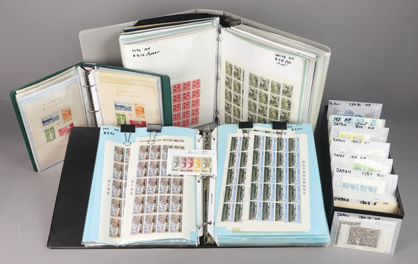 755 imageJapan & Ryukyus, Excellent Mostly Mint Dealer Stock in Singles, Blocks & Sheets, 1947-2002, two binders of miniature sheets, one for Japan to 1984 and one for Ryukyus; Japan includes six examples of the scarce Horyu Temple Pagoda souvenir sheet (#385a), a counter book of mostly National Park souvenir sheets with many extra folders, and a glassine file of mostly mint in singles and blocks to 2002, all in Scott catalogue order, along with Ryukyus stock as well; other better mint include Japan #283a (5, all in folders), 403 (2 mini-sheets, one used), 448b, 735 (mini-sheet), 769 (mini-sheet), C9-C13, and Ryukyus #89 (mini-sheet), 103 (mini-sheet), 104 (mini-sheet), generally Fine to Very Fine, additional scans & video online. Shipping charges apply - weight 15.6 lbs. (PDF for this Lot) (Video for this lot) (Video2 for this lot) (Image1)