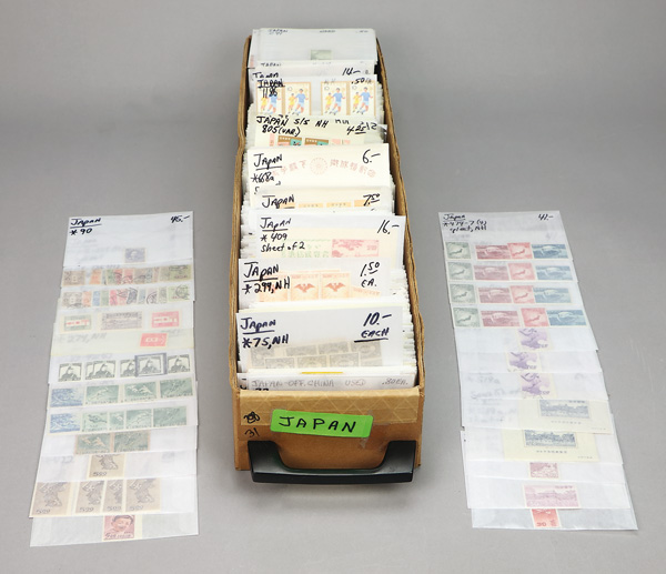 754 imageJapan, Valuable and Massive Stock Selection, 1875-2004, originally received filling the best part of a 24-inch-long (60cm) glassine box, many thousands of stamps ranging between #41 and 2885 plus several Furosato, Semi-Postal and Airmail issues as well; majority mint with much of that never hinged and Post Office fresh; all glassined, identified by Scott and whether mint or used, and with (likely outdated) catalogue values indicated; note singles, complete sets, a couple souvenir sheets, etc., in useful quantities throughout; note some better including (mint, unless noted) #90, 115-125 (2 used), 163-165, 213, 274 (6), 417-421 (2), 422 (5, 1 never hinged), 456a, 474-477 (4), 479 (3, 2 used), 519a (2), 609, C43, and much more besides; approximately US$14,000 in catalogue value—likely outdated—by our calculation; well worth the busy dealer's careful review, Very Fine overall, inspection invited. Shipping charges apply - weight 6.8 lbs. (Image1)