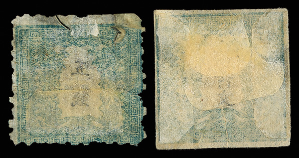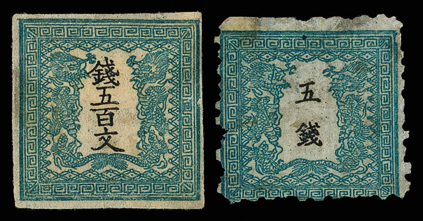 736 O image1871-72, Dragon, 500m blue green, plate 1, wove paper & 5s blue green, laid paper (J.S.C.A. 4g, 8a. Scott 4d, 8), each with appealing color and very faint cancel; #4d multiple hinges, #8a couple tiny bright spots normal for this thin paper, Fine to Very Fine. Scott $1,350 (HK$ 10,380). (Image1) (Image2) (All Images)