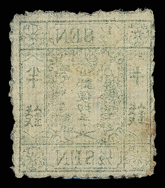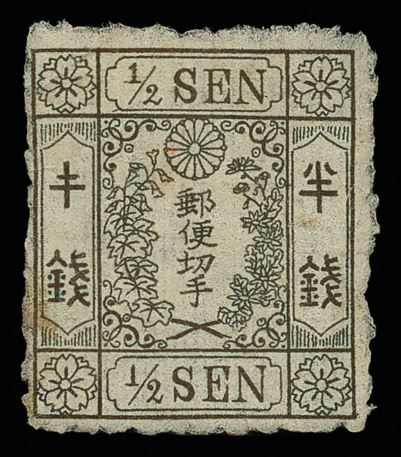 737 og image1872, Cherry Blossom, ½s brown, Matsuda printing, type III, native wove paper, "kihan" error (J.S.C.A. 9v-4-23m. Scott 9a), Plate 4, position 23, missing the diagonal strokes of the upper left character, fresh with strong color, full, usual crackly o.g., nearly Very Fine, a lovely example of this rare issue. Scott $2,100 (HK$ 16,150). (Image1) (Image2) (All Images)