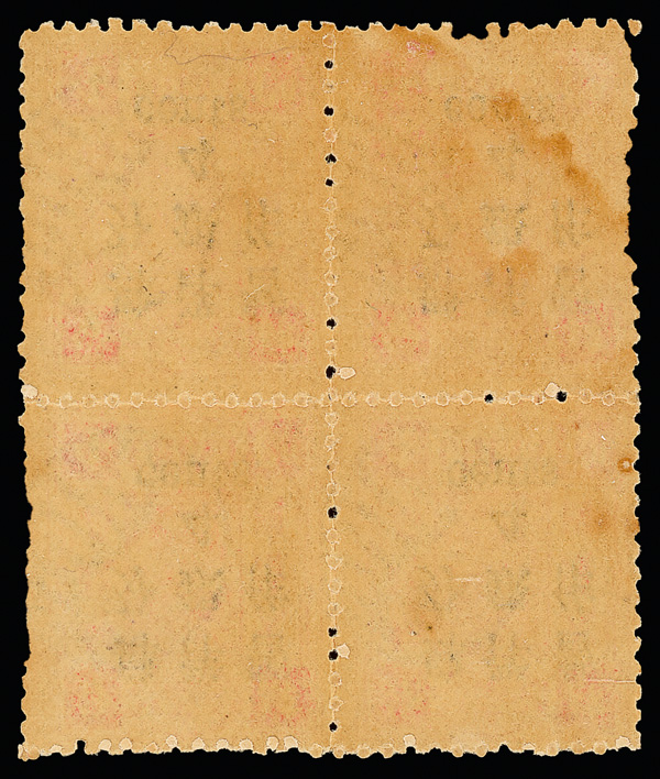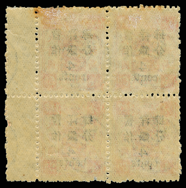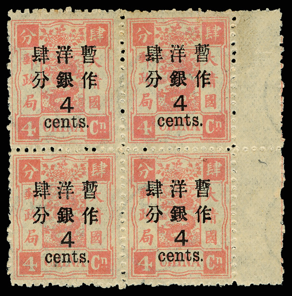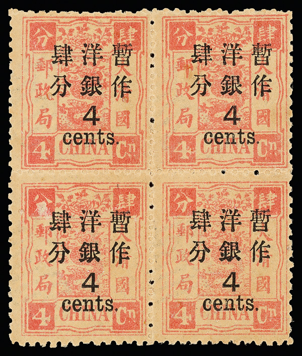 112 nhbl image1897, Large Figures narrow surcharge on Dowager, 1st printing, 4¢ on 4ca rose pink (Chan 68. Scott 59), block of 4, a lovely multiple with rich color; no sign of hingeing, but gum disturbed position 4 (noted for accuracy), Fine to Very Fine. Scott $1,160 as singles (HK$ 8,920). (Image1) (Image2) (All Images)