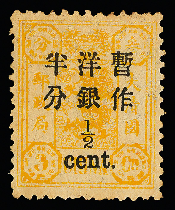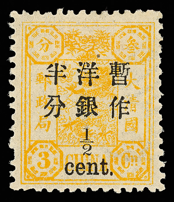 107 og image1897, Large Figures narrow surcharge on Dowager, 1st printing, ½¢ on 3ca orange yellow (Chan 65. Scott 56), with intense color and crisp, bold surcharge, o.g., hinged, Very Fine. Scott $525 (HK$ 4,040). (Image1) (Image2) (All Images)